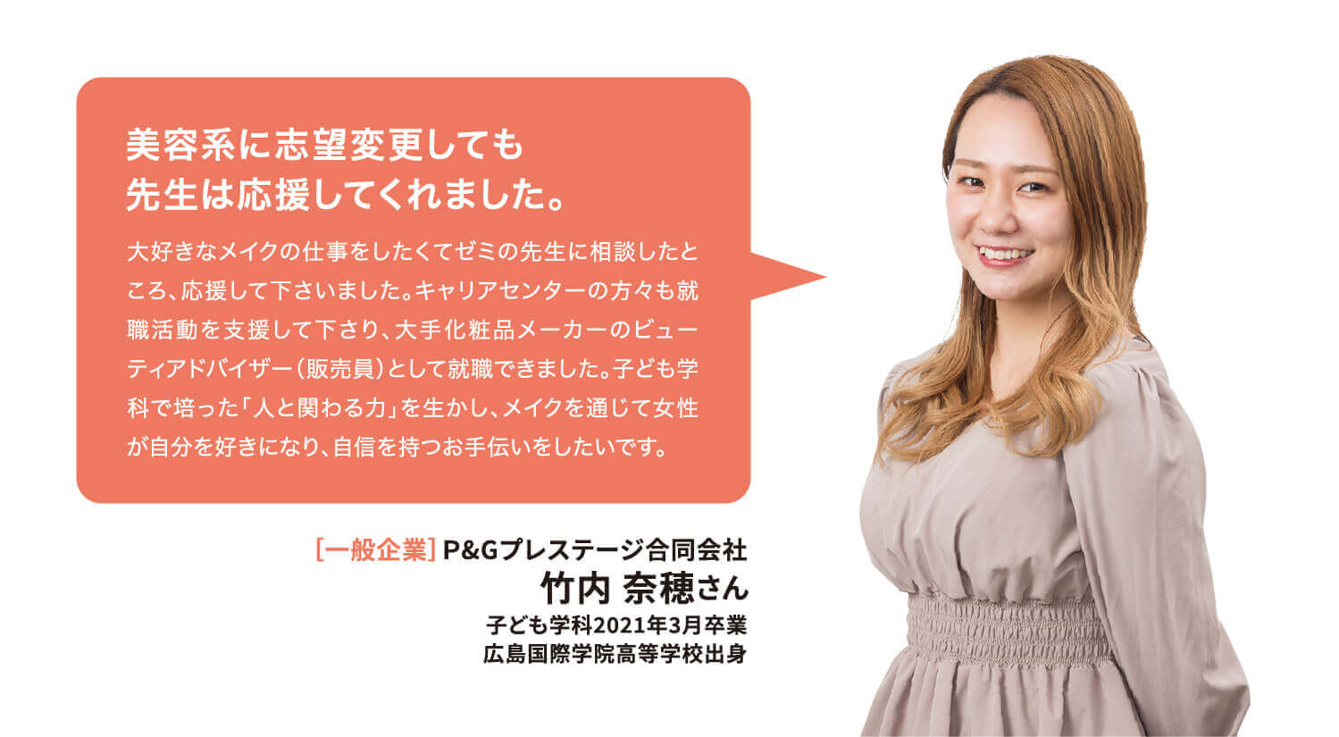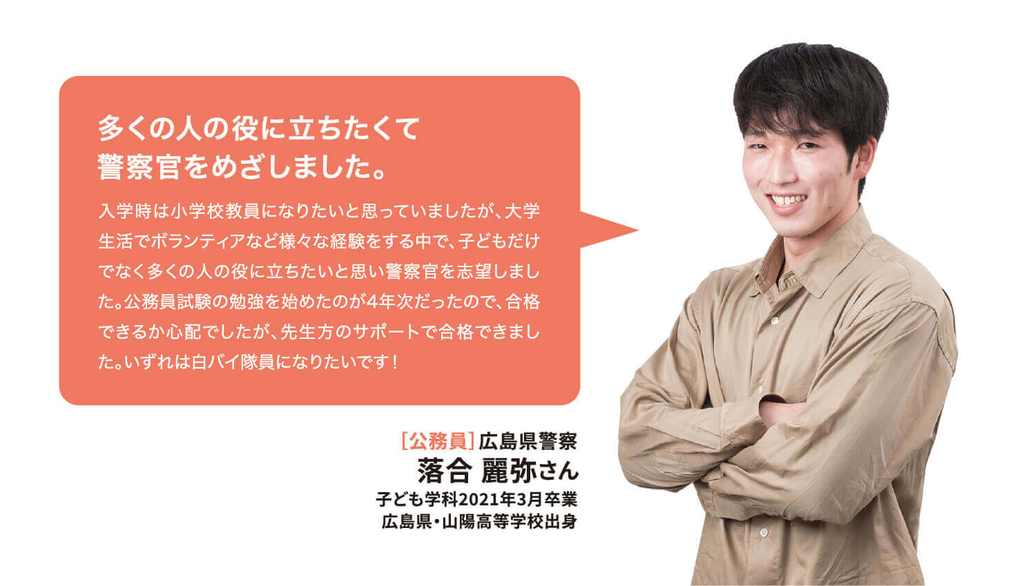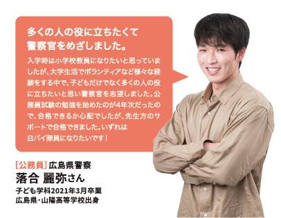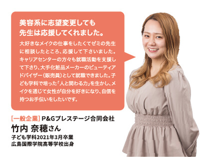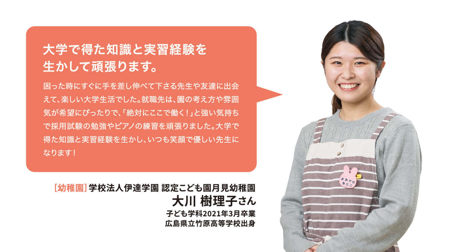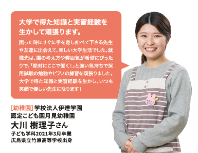 就職率 小学校・特別支援学校・幼稚園・保育所・認定こども園で多くの卒業生が活躍! 主な就職先一覧 (過去3年実績) 小学校 広島県・市公立小学校、出雲市公立小学校 認定こども園 こうわ認定こども園堀越、ロータスプリスクール西原、法輪学園アンカ子ども園、認定こども園月見幼稚園、認定仁方こども園、三原市公立認定こども園、認定こども園蓮生・まこと幼稚園、認定こども園サムエル広島子どもの園、認定こども園賀茂川、認定こども園めばえ幼稚舎、広島県同胞援護財団、認定こども園せいれんじ、広島光明学園、ひまわり福祉会 ひまわり認定こども園 幼稚園 祇園幼稚園、聖モニカ幼稚園、三次清心幼稚園、りゅうせん幼稚園 保育所 〈公立保育所〉三次市、松江市、広島市、岩国市、萩市、光市〈私立保育所〉青雲保育園、ほうりんフレンズ保育園、つきのひかり国際保育園、法輪学園、横路保育所、葵新生会、新生保育園、タスク・フォース、HOPPA、吉備のくに福祉会みどり保育園、あい福祉会あい保育園祇園、微妙福祉会、広島常光福祉会、なかよし保育園、佐東ひかり保育園、みつる保育園、千田保育園、かおる保育園、丸石子どもの家、りじょうKIDSたかや、ぽけっとランド、清心保育園、アイグラン、コネクタ、日本保育サービス、広島修道院、ナーガ保育園、旭が丘学園、こぐま保育園、東城有栖会 福祉 呉同済義会仁風園、八幡学園、さくら福祉会母子生活支援施設いもせハイツ、児童養護施設こぶしヶ丘学園、放課後等デイサービスライフ、春日野まごころ保育園、太田川学園、ライフアシスト、クオーレ、児童デイサービスすてーじ、香月産婦人科、光の園摂理の家 一般職 〈教育・福祉系企業〉ららぽーと千代田、西部教育事務所、イベントグループ、クラ・ゼミ、奏音、チモロ、アイグラン、アイドゥー 〈その他企業〉コシダカ、日本写真判定、大之木建設、P&Gプレステージ合同会社、COCOPLUS八丁堀店、広島綜合警備保障、しまなみ信用金庫、山口フィナンシャルグループ、広島トヨペット、ヤナセ、トヨタカローラ広島、マツダ、広島日産自動車、サコダ車輛、JA広島支部、全農広島鶏卵、明治安田生命保険、第一生命保険、タマホーム、シティホーム、エディオン、アートコーポレーション、中四国丸和ロジスティクス、アウトソーイングテクノロジー、エイジェック、ヒロホー、讃岐屋、MXモバイル、兼松コミュニケーションズ、ダックス、ウィゴー、ユナイテッドアローズ、アーバンリサーチ、池田ハルク、アークプロジェクト、サニクリーン中国、古川製作所、ロジコム 公務員 広島県警察 進学 広島文化学園大学大学院教育学研究科、学校法人川原学園東京動物専門学校 卒業生VOICE 広島文化学園大学で夢を叶え、社会で活躍する先輩にインタビューしました。
