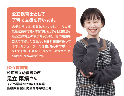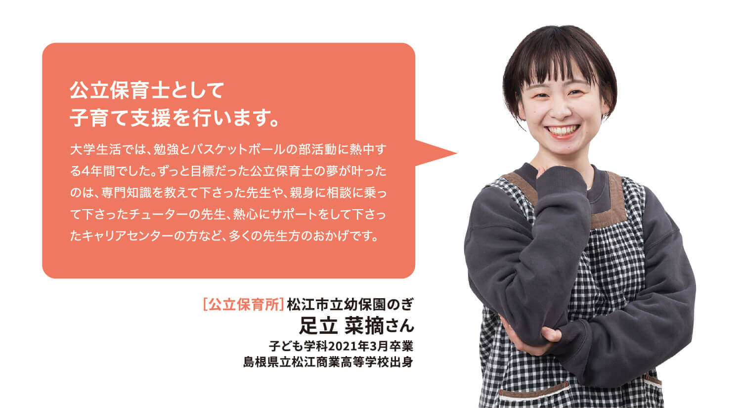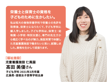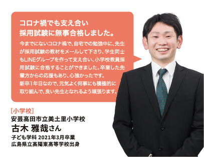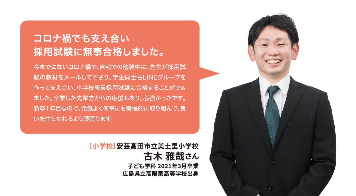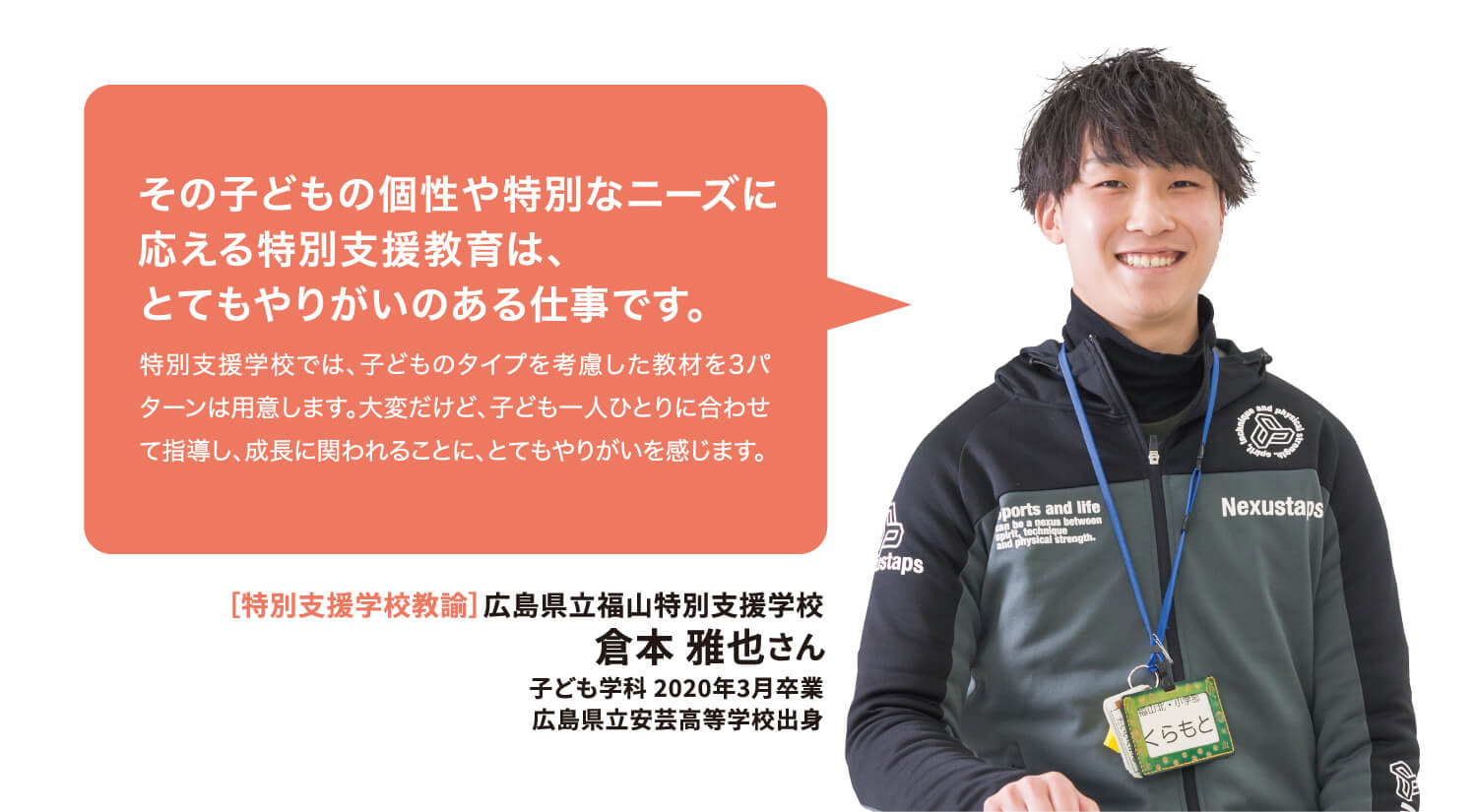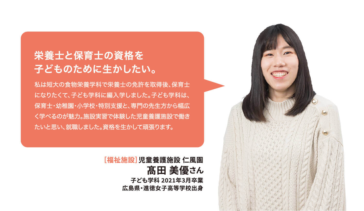 就職率 小学校・特別支援学校・幼稚園・保育所・認定こども園で多くの卒業生が活躍! 主な就職先一覧 (過去3年実績) 小学校 広島県・市公立小学校、出雲市公立小学校 認定こども園 こうわ認定こども園堀越、ロータスプリスクール西原、法輪学園アンカ子ども園、認定こども園月見幼稚園、認定仁方こども園、三原市公立認定こども園、認定こども園蓮生・まこと幼稚園、認定こども園サムエル広島子どもの園、認定こども園賀茂川、認定こども園めばえ幼稚舎、広島県同胞援護財団、認定こども園せいれんじ、広島光明学園、ひまわり福祉会 ひまわり認定こども園 幼稚園 祇園幼稚園、聖モニカ幼稚園、三次清心幼稚園、りゅうせん幼稚園 保育所 〈公立保育所〉三次市、松江市、広島市、岩国市、萩市、光市〈私立保育所〉青雲保育園、ほうりんフレンズ保育園、つきのひかり国際保育園、法輪学園、横路保育所、葵新生会、新生保育園、タスク・フォース、HOPPA、吉備のくに福祉会みどり保育園、あい福祉会あい保育園祇園、微妙福祉会、広島常光福祉会、なかよし保育園、佐東ひかり保育園、みつる保育園、千田保育園、かおる保育園、丸石子どもの家、りじょうKIDSたかや、ぽけっとランド、清心保育園、アイグラン、コネクタ、日本保育サービス、広島修道院、ナーガ保育園、旭が丘学園、こぐま保育園、東城有栖会 福祉 呉同済義会仁風園、八幡学園、さくら福祉会母子生活支援施設いもせハイツ、児童養護施設こぶしヶ丘学園、放課後等デイサービスライフ、春日野まごころ保育園、太田川学園、ライフアシスト、クオーレ、児童デイサービスすてーじ、香月産婦人科、光の園摂理の家 一般職 〈教育・福祉系企業〉ららぽーと千代田、西部教育事務所、イベントグループ、クラ・ゼミ、奏音、チモロ、アイグラン、アイドゥー 〈その他企業〉コシダカ、日本写真判定、大之木建設、P&Gプレステージ合同会社、COCOPLUS八丁堀店、広島綜合警備保障、しまなみ信用金庫、山口フィナンシャルグループ、広島トヨペット、ヤナセ、トヨタカローラ広島、マツダ、広島日産自動車、サコダ車輛、JA広島支部、全農広島鶏卵、明治安田生命保険、第一生命保険、タマホーム、シティホーム、エディオン、アートコーポレーション、中四国丸和ロジスティクス、アウトソーイングテクノロジー、エイジェック、ヒロホー、讃岐屋、MXモバイル、兼松コミュニケーションズ、ダックス、ウィゴー、ユナイテッドアローズ、アーバンリサーチ、池田ハルク、アークプロジェクト、サニクリーン中国、古川製作所、ロジコム 公務員 広島県警察 進学 広島文化学園大学大学院教育学研究科、学校法人川原学園東京動物専門学校 卒業生VOICE 広島文化学園大学で夢を叶え、社会で活躍する先輩にインタビューしました。
