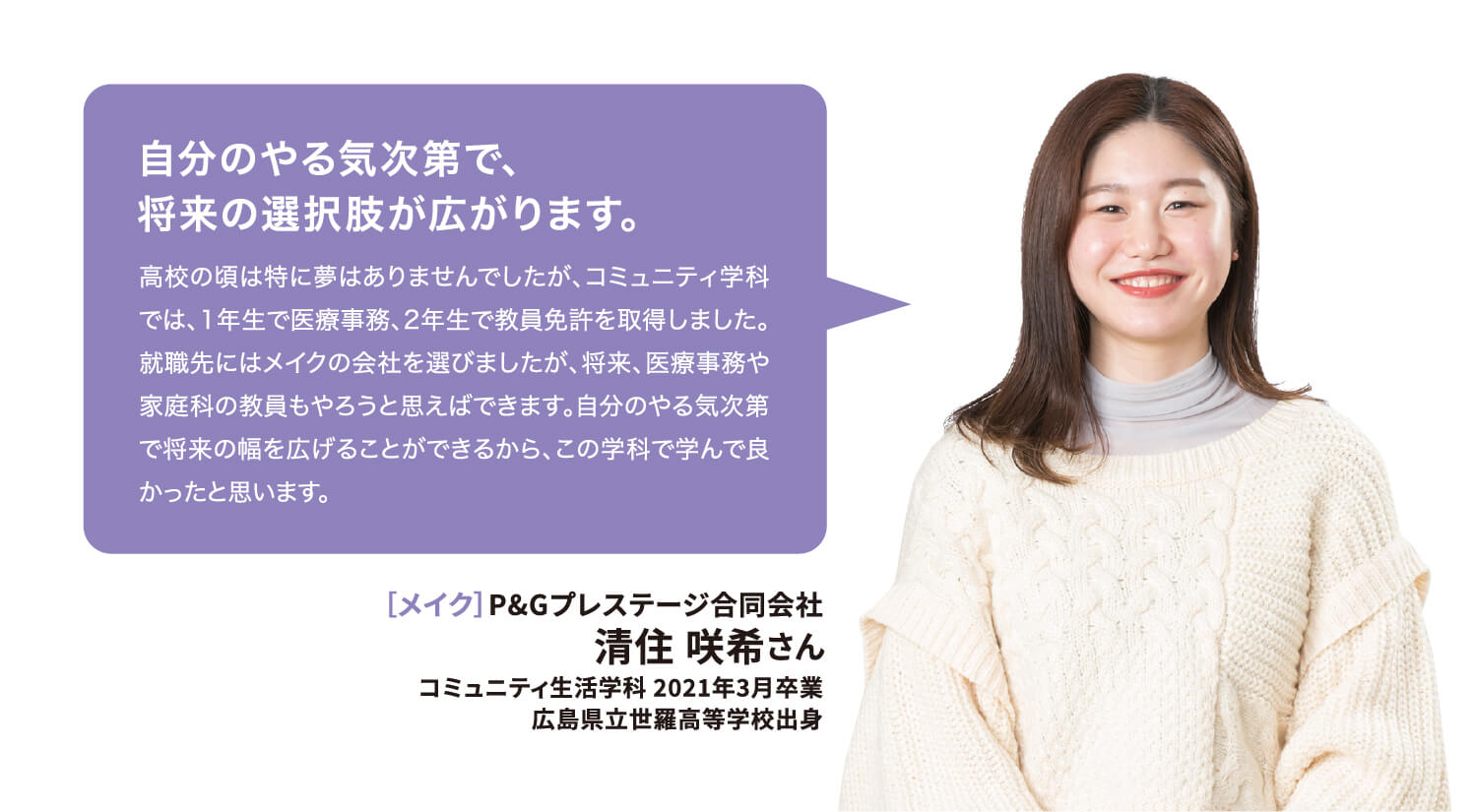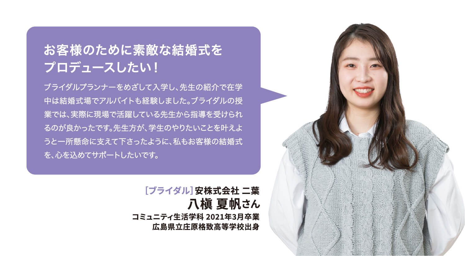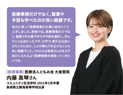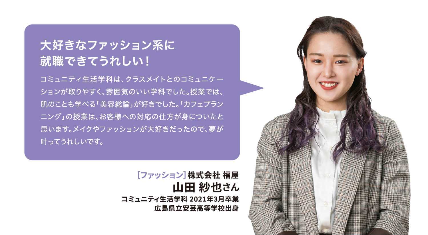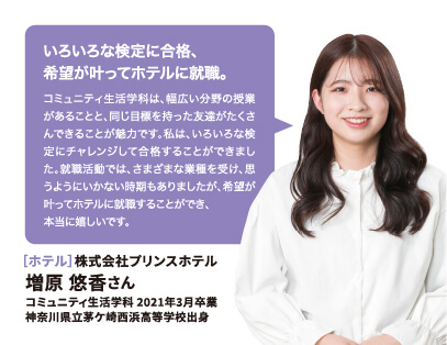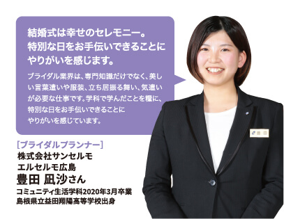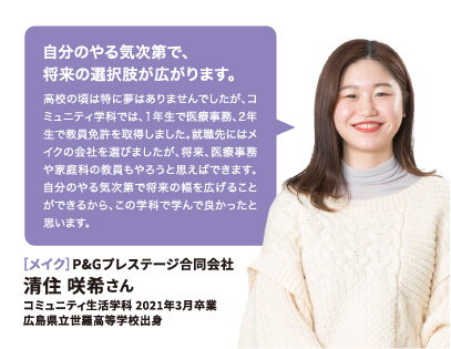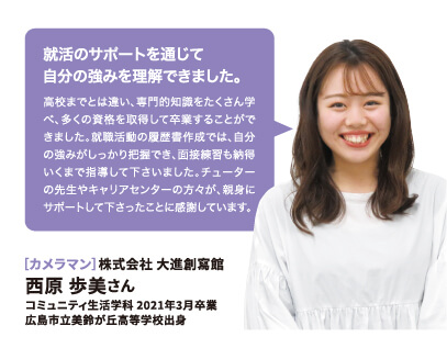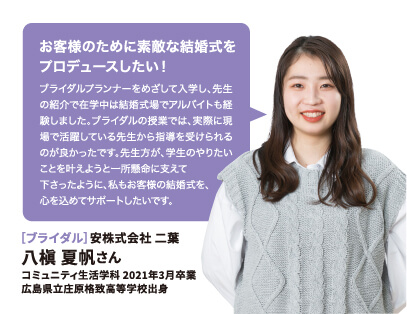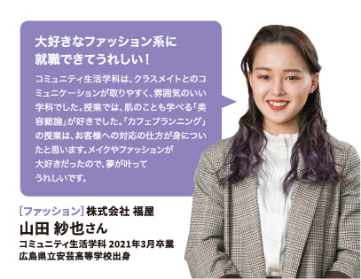 就職率 ファッション・美容・ホテル・ブライダル業界の就職に強いのはもちろん、教育機関や一般企業まで、幅広い職種・職業へ多くの卒業生が就職を果たしています。 主な就職先一覧 (過去3年実績) ファッション関係 (株)ザ・キッス、(株)アダストリア、(株)アビリティーライフ、(株)オンワード樫山、(株)彩さ美、(株)サンポークリエイト、(株)ジーンズカジュアルダン、(株)スタッフブリッジ、(株)そごう・西武、(株)チュチュアンナ、(株)ファッションナビ、(株)フランス屋、(株)ブルーメイト、(株)やしま、(有)キャピタル、(株)やまと、(株)マークスタイラー、(株)パル、(株)福屋、(株)キャン、ピウボーテ、(株)ジュングループ、(株)ノーリーズ、(株)マイケル・コースジャパン、(株)ワールドストアパートナーズ、(株)イッセイミヤケ、(株)サマンサタバサジャパンリミテッド、(株)アルビオン、(株)NOVA、(株)シーボン、(株)メディビューティー、P&Gプレステージ合同会社、(有)このみや、(株)リラクゼーションヴィラ、㈱アルファベットパステル、(株)ルネティルタ など フード・ブライダル関係 (株)リーガロイヤルホテル広島、(株)EVENTOS、三吉屋食品(株)、伯和グループ、フレスコサンドカフェ、メランジュドゥシュハリ、(株)京都嵯峨野、(株)大進創寫館、(株)バンケット・エスエス、(株)二葉、(株)プリンスホテル、(株)STUDIO ARC、ノートルダム広島、ユーベル(株)、日清医療食品(株)、(株)バサラダイニング、アロフト(株)、スターバックスコーヒージャパン(株)、(株)母恵夢本舗、(株)グリーンハウスフーズ、(株)ジョイフルまるやま、(株)サンセルモ、(株)商業藝術、岡山プラザホテル、山の手リゾート(株)、(株)ベッセルホテル開発、ヒロボシ(株)、(株)フレスカ、THE Perth、カクサン食品(株)、木下(株)、フォトアトリエエノ、(株)テイクアンドギヴニーズ、玉造温泉白石家 など 一般企業 (株)アイグラン、(株)エディオン、(株)ハローズ、(株)トヨタレンタリース広島、ELJソーラーコーポレーション(株)、安芸農業協同組合、みしま歯科、メープルヒル病院、(株)ニチイ学館、山陽土木(株)、しまなみ信用金庫、社会福祉法人成城会、菅原汽船(株)、トヨタカローラ広島(株)、ニッポンレンタカーサービス(株)、日本郵便(株)、パナソニック(株)エコソリューションズ社、林原歯科クリニック、ひと・いきいきカンパニー(株)、ひまわり歯科、広島トヨタ自動車(株)、防長交通(株)、三原農業協同組合、山本歯科医院、マイライフ(株)、(株)エイジェック、明治安田生命保険相互会社、(株)コスモス薬品、中国木材(株)、光昭(株)、(株)マツダオートザム海田、(株)国井産業、(株)イズミ、広島祇園スマイル歯科小児歯科医院、長崎病院、クリスタル歯科クリニック、岡村医院、広島クリエイトファクトリー、日産プリンス広島販売(株)、(株)タイヨー、(株)サイネックス、(株)メディカルフォレスト、二村自動車(株)、(株)ビリーフ、山口トヨタ自動車(株)、医療法人社団ひがしの会、呉整形外科クリニック、大倉医院ホワイトエッセンス広島駅前歯科、森整形外科、そえだ歯科医院 など 学校・幼稚園・公務員 本浦幼稚園、府中ひかり幼稚園、陸上自衛隊、愛媛県警察 など 卒業生VOICE 広島文化学園大学で夢を叶え、社会で活躍する先輩にインタビューしました。