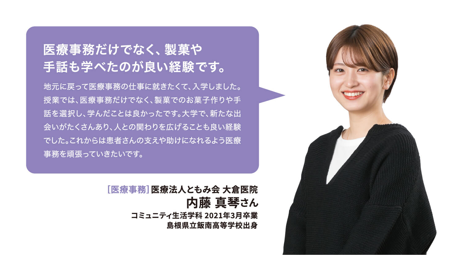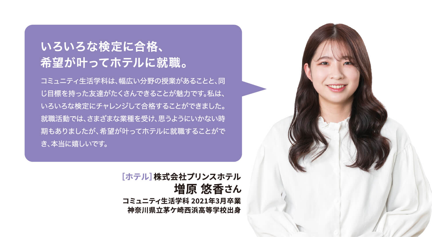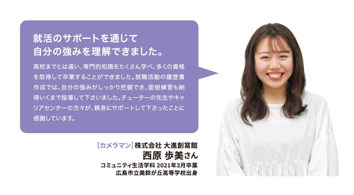 就職率 ファッション・美容・ホテル・ブライダル業界の就職に強いのはもちろん、教育機関や一般企業まで、幅広い職種・職業へ多くの卒業生が就職を果たしています。 主な就職先一覧 (過去3年実績) ファッション関係 (株)ザ・キッス、(株)アダストリア、(株)アビリティーライフ、(株)オンワード樫山、(株)彩さ美、(株)サンポークリエイト、(株)ジーンズカジュアルダン、(株)スタッフブリッジ、(株)そごう・西武、(株)チュチュアンナ、(株)ファッションナビ、(株)フランス屋、(株)ブルーメイト、(株)やしま、(有)キャピタル、(株)やまと、(株)マークスタイラー、(株)パル、(株)福屋、(株)キャン、ピウボーテ、(株)ジュングループ、(株)ノーリーズ、(株)マイケル・コースジャパン、(株)ワールドストアパートナーズ、(株)イッセイミヤケ、(株)サマンサタバサジャパンリミテッド、(株)アルビオン、(株)NOVA、(株)シーボン、(株)メディビューティー、P&Gプレステージ合同会社、(有)このみや、(株)リラクゼーションヴィラ、㈱アルファベットパステル、(株)ルネティルタ など フード・ブライダル関係 (株)リーガロイヤルホテル広島、(株)EVENTOS、三吉屋食品(株)、伯和グループ、フレスコサンドカフェ、メランジュドゥシュハリ、(株)京都嵯峨野、(株)大進創寫館、(株)バンケット・エスエス、(株)二葉、(株)プリンスホテル、(株)STUDIO ARC、ノートルダム広島、ユーベル(株)、日清医療食品(株)、(株)バサラダイニング、アロフト(株)、スターバックスコーヒージャパン(株)、(株)母恵夢本舗、(株)グリーンハウスフーズ、(株)ジョイフルまるやま、(株)サンセルモ、(株)商業藝術、岡山プラザホテル、山の手リゾート(株)、(株)ベッセルホテル開発、ヒロボシ(株)、(株)フレスカ、THE Perth、カクサン食品(株)、木下(株)、フォトアトリエエノ、(株)テイクアンドギヴニーズ、玉造温泉白石家 など 一般企業 (株)アイグラン、(株)エディオン、(株)ハローズ、(株)トヨタレンタリース広島、ELJソーラーコーポレーション(株)、安芸農業協同組合、みしま歯科、メープルヒル病院、(株)ニチイ学館、山陽土木(株)、しまなみ信用金庫、社会福祉法人成城会、菅原汽船(株)、トヨタカローラ広島(株)、ニッポンレンタカーサービス(株)、日本郵便(株)、パナソニック(株)エコソリューションズ社、林原歯科クリニック、ひと・いきいきカンパニー(株)、ひまわり歯科、広島トヨタ自動車(株)、防長交通(株)、三原農業協同組合、山本歯科医院、マイライフ(株)、(株)エイジェック、明治安田生命保険相互会社、(株)コスモス薬品、中国木材(株)、光昭(株)、(株)マツダオートザム海田、(株)国井産業、(株)イズミ、広島祇園スマイル歯科小児歯科医院、長崎病院、クリスタル歯科クリニック、岡村医院、広島クリエイトファクトリー、日産プリンス広島販売(株)、(株)タイヨー、(株)サイネックス、(株)メディカルフォレスト、二村自動車(株)、(株)ビリーフ、山口トヨタ自動車(株)、医療法人社団ひがしの会、呉整形外科クリニック、大倉医院ホワイトエッセンス広島駅前歯科、森整形外科、そえだ歯科医院 など 学校・幼稚園・公務員 本浦幼稚園、府中ひかり幼稚園、陸上自衛隊、愛媛県警察 など 卒業生VOICE 広島文化学園大学で夢を叶え、社会で活躍する先輩にインタビューしました。